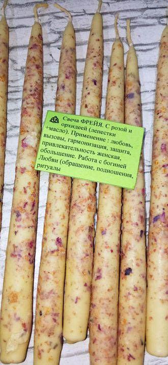 Свеча ФРЕЙЯ. С розой и орхидеей (лепестки +масло). Применение : любовь, вызовы, гармонизация, защита,