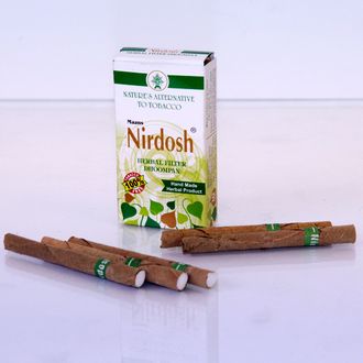 Нирдош - сигареты без табака, для тех, кто бросает курить. Состав: Индийский тмин - обладает ветрогонным и антисептическим действием. Эффективен при лечении инфекций в горле, респираторных заболеваний и кашля, при коликах, вздутии желудка, диарее. Коричник цейлонский - обладает ветрогонным, вяжущим действием, стимулирует пищеварение, Используют при лечении хронического кашля, инфекций в горле, эффективна против расстройств ЖКТ. Гвоздика душистая (бутоны) - обладает ветрогонным, антиспазматическим, антивирусным действием, способствует пищеварению. Эффективное средство зубной гигиены, при инфекциях в горле. Калган большой (корень) - обладает жаропонижающим, отхаркивающим, противогрибковым действием, способствует пищеварению. Эффективное бронхорасширяющее средство, хорошо освежает полость рта. Гуггул, или коммифора Уайта (камеде-смола) - обладает отхаркивающим, противовоспалительным действием. Предотвращает вздутие и раздражение желудка. Солодка гладкая, или лакричник (корень) - обладает послабляющим, отхаркивающим, смягчающим, успокаивающим и антибактериальным действием. Применяется при кашле, простуде, инфекциях в горле, при язве желудка. Базилик священный (листья) - обладает отхаркивающим, потогонным и антимикробным действием. Снимает стресс и напряжение, лечит кожные инфекции, раны, несварение желудка и тошноту. Куркума длинная (корневище) - обладает ветрогонным, противовоспалительным, гепатопротекторным, антисептическим действием. Эффективна при инфекциях в горле, крапивнице, аллергии, при лечении ран. Хурма коромандельская (листья) - обладает ветрогонным, мочегонным, противовоспалительным и противоопухолевым действием. В НИРДОШ использована как обёрточный лист. Нирдош не имеет побочных эффектов при регулярном употреблении.
